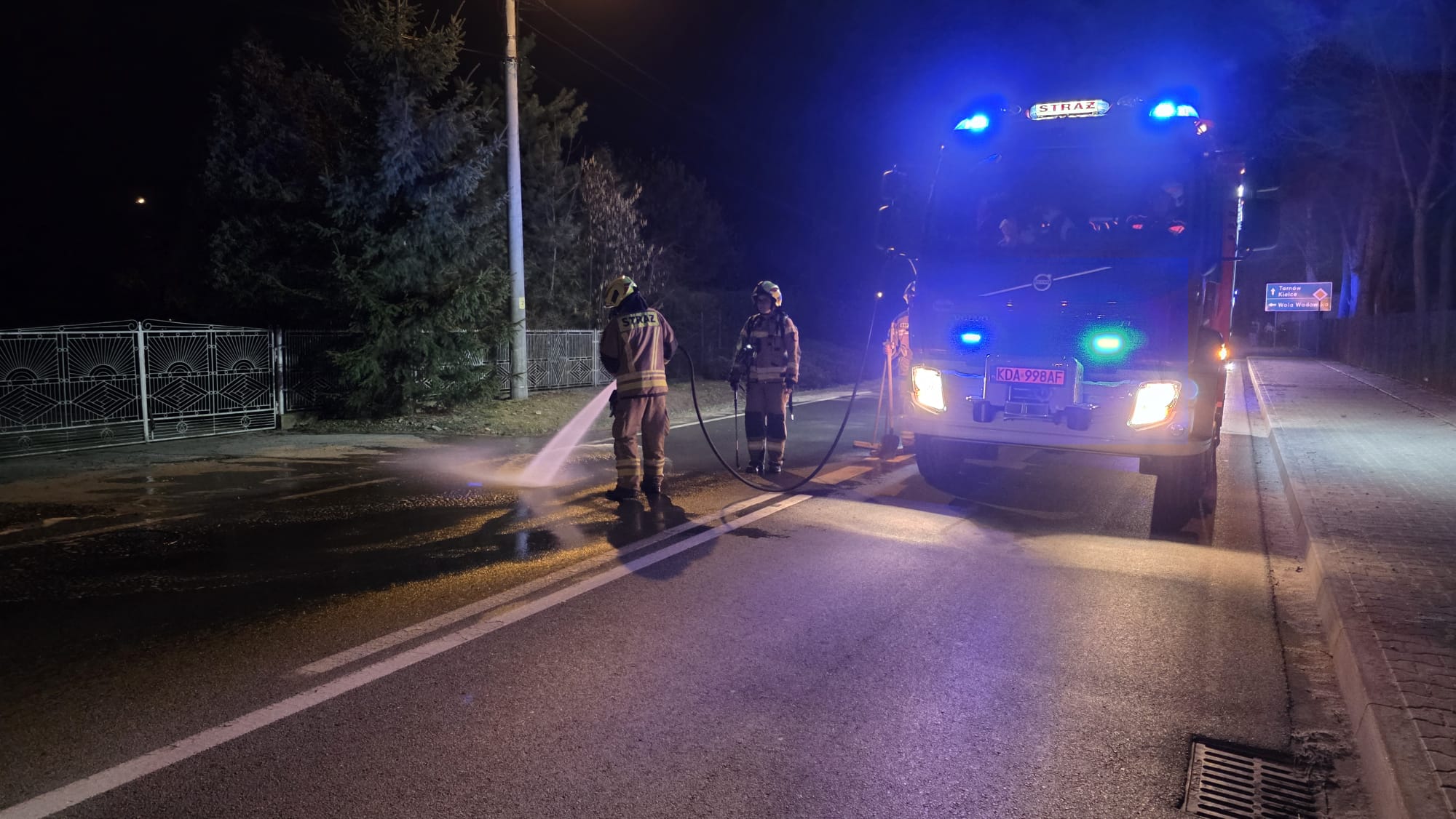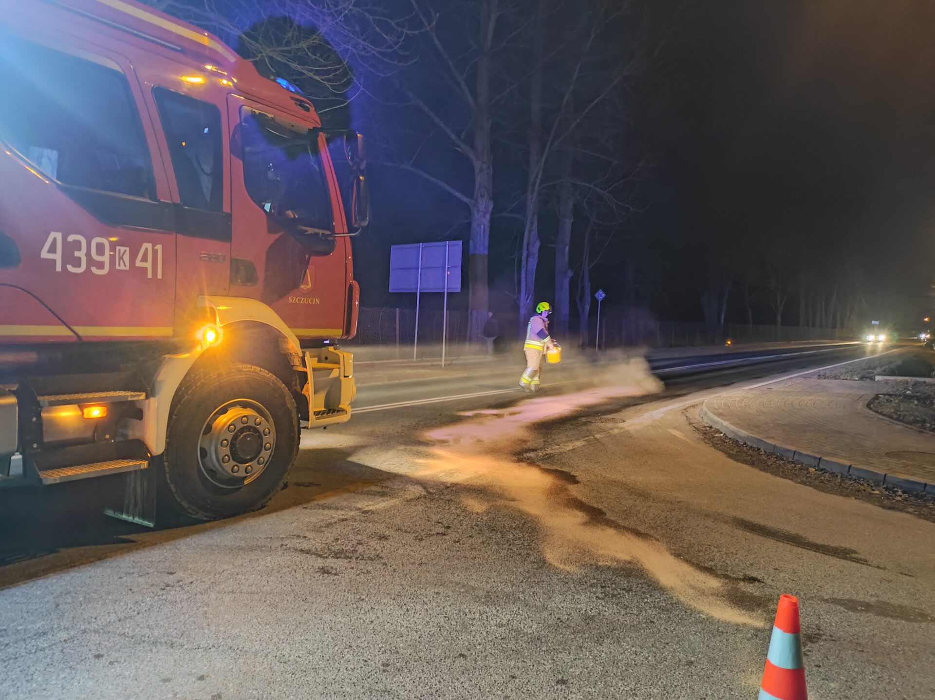 W dniu 10 marca, ponownie w godzinach wieczornych, nasza jednostka została zadysponowana do zdarzenia. Tym razem w Szczucinie na ul. Wolności, gdzie na drodze miała znajdować się plama oleju. Po dojeździe na miejsce zdarzenia oraz przeprowadzeniu rozpoznania przez KDR z OSP stwierdzono, że plama oleju znajduje się na skrzyżowaniu ulic Wolności i Bohaterów Września oraz ciągnie się na odcinku około 150 metrów na drodze wojewódzkiej DW 982. Nasze działania polegały na zabezpieczeniu miejsca zdarzenia, usunięciu plamy oleju przy użyciu sorbentu oraz środka do odtłuszczania (Sintan), a następnie zmyciu nawierzchni jezdni. W trakcie prowadzonych działań ruch na drodze wojewódzkiej DW 982 odbywał się wahadłowo. W działaniach brał udział zastęp OSP Szczucin (GBARt) oraz JRG Dąbrowa Tarnowska (GBARt).
